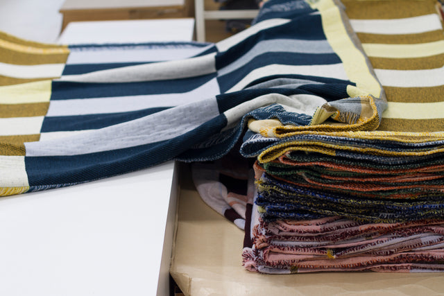 Our recycled blankets are woven from recycled wool, made from post-consumer textile waste from the fashion industry. Used wool garments are sorted by colour, broken down and re-spun into yarns, woven and hand-finished using traditional techniques in British mills. This process can result in small imperfections and colour variabilities, which are unavoidable and part of the uniqueness of a sustainable material.
